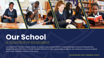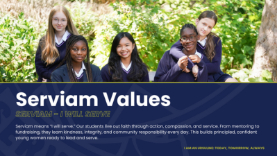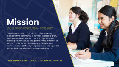 As an Ursuline school, we have been entrusted by St Angela, our foundress, to continue to live out her vision of educating young women of tomorrow. Our school motto is “Serviam” meaning “I shall serve.” We are a testament to this in that our school community bears witness to God’s love; whereby each individual is encouraged to serve and love one another.